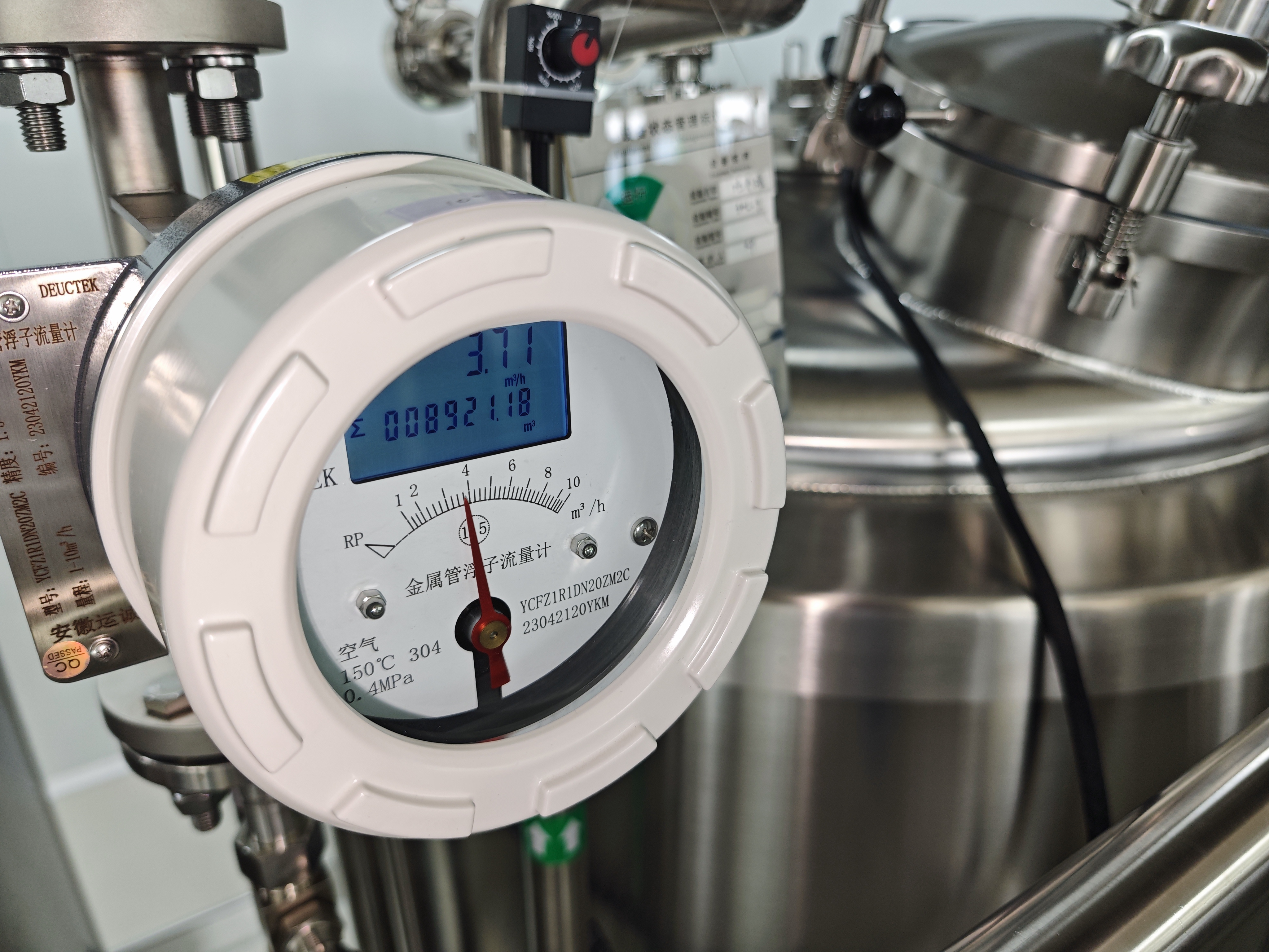 生产用大通量空气流量计,接触气体的管道可选304或者316L洁净不锈钢;流量计表盘机械、数字两种流量显示方式,数字模块可接入微藻培养控制系统,实现控制比例电磁阀开关大小,调整通气量